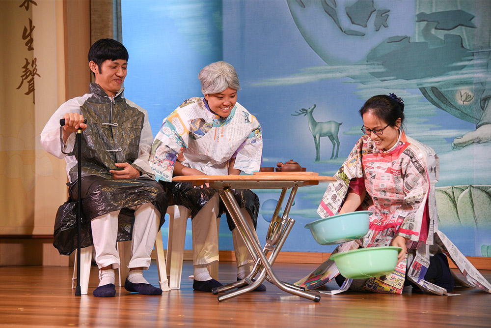 Dressed in performance costumes made of environmentally friendly materials, the volunteers advocate environmental protection with lively and fun plays. (Photo by Ng Shey Ying)