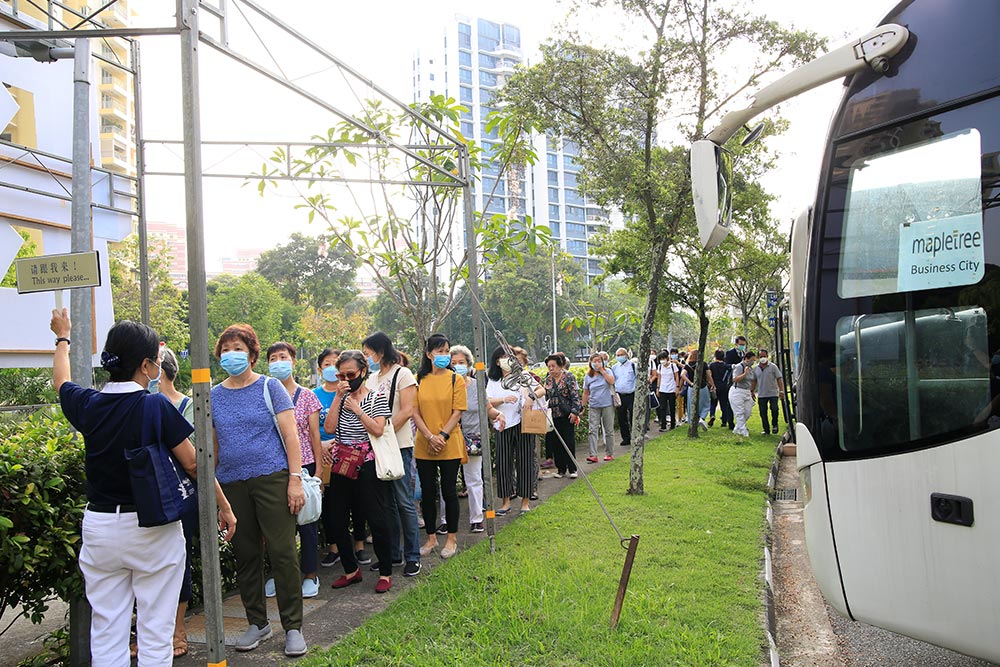 志工们安排穿梭巴士接送部分民众前往静思堂。(摄/ 冯桂琼)