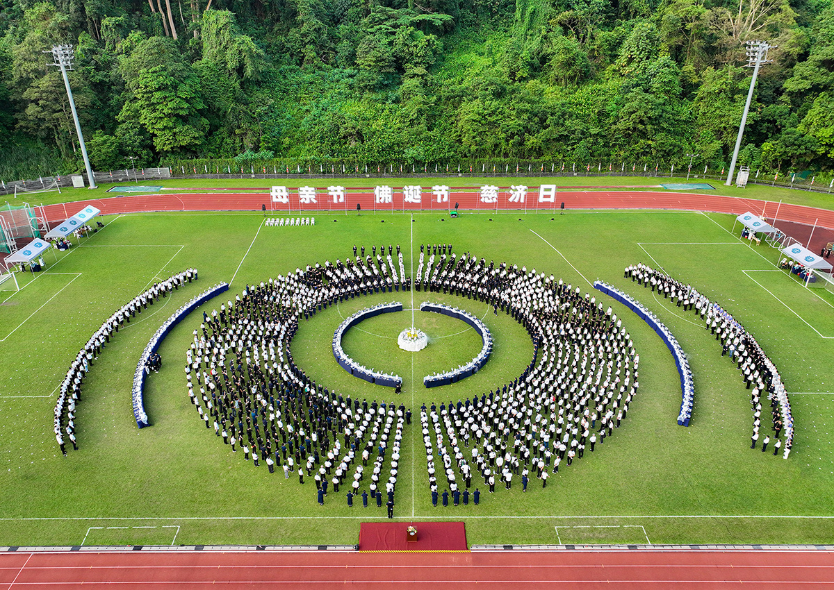 2023年浴佛队形以同心圆和两个半月呈现。同心圆的图腾是慈济的“TC”和57周年的“57”,象征慈济人走入人群内修外行的精神。(摄/ 航拍画面)