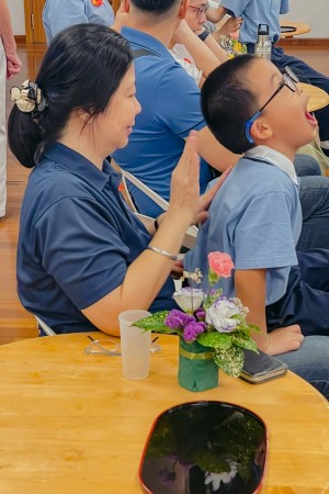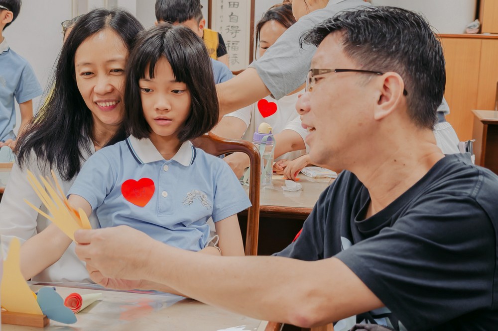 由于空间的局限,本次活动采用攻站方式,奉茶仪式设在一楼多功能教室,小手牵大手手作区设在二楼花道教室与大会议室,亲子互动游戏区设在三楼佛堂。孩子们通过手工折纸、互动游戏,感受到亲情的温度与“爱要及时”的真谛。
