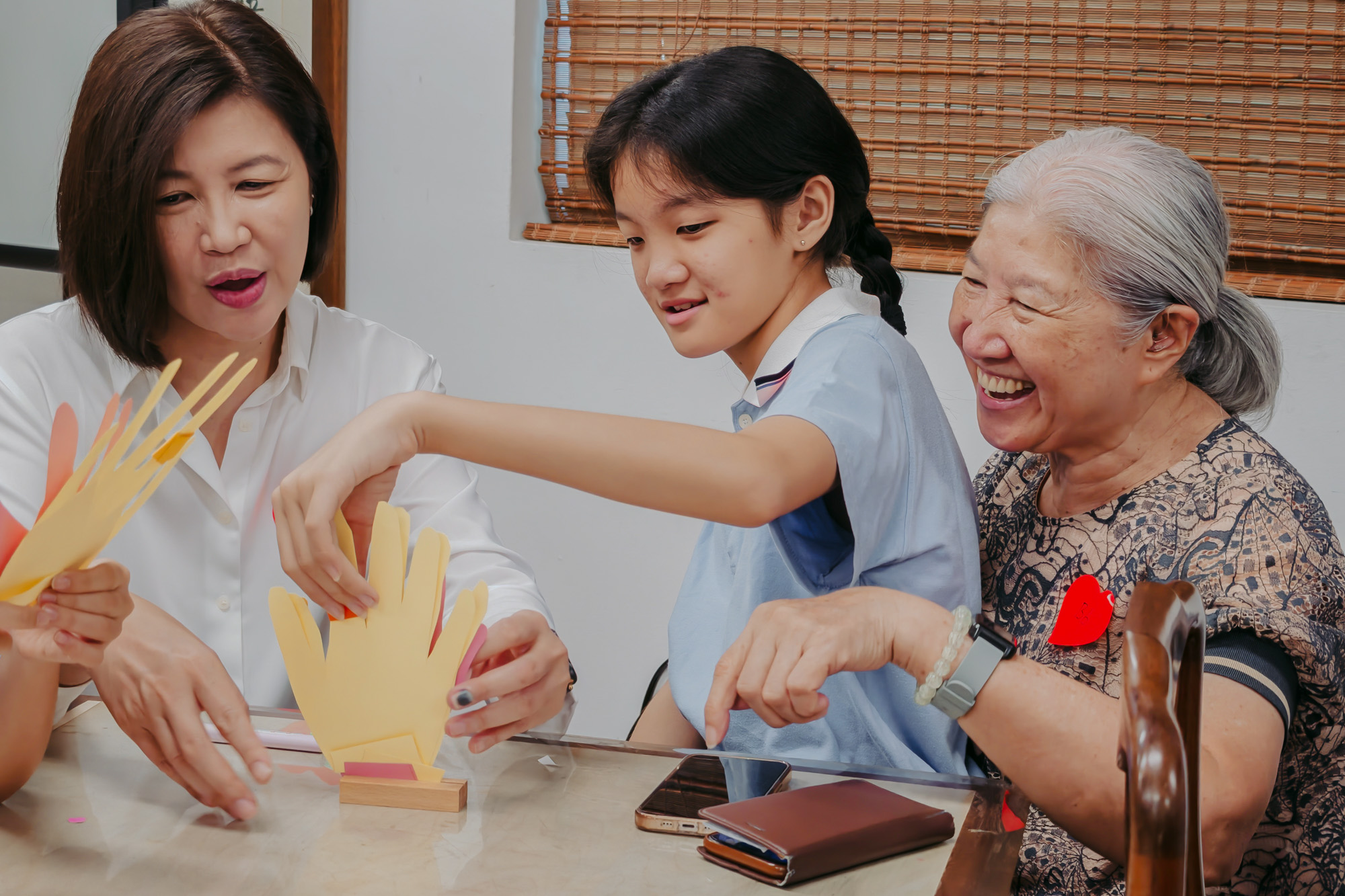 “这双布满茧、又有点歪曲的手,是我一生的写照。奶奶蔡雅岁(下图右)边笑边举起刚画好的“大手卡”,满脸洋溢着幸福的笑容。在“手工折纸、传递亲情”环节中,小手牵大手的互动,勾勒出三代同堂的温馨画面。