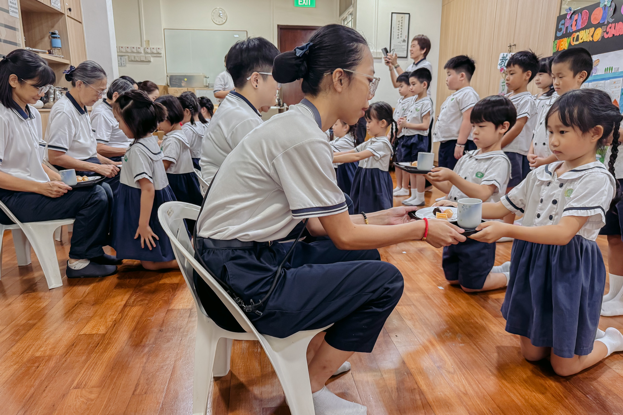 翌日,孩子们亲手喂食给三梯次的老师们,并献上奉茶礼,以表对师长的深情谢意。来自婴儿部的洪雅娇老师分享:“其中两位我从婴儿时期就开始陪伴,今天看到他们能如此稳重地完成奉茶仪式,我感到无比欣慰与感动。”