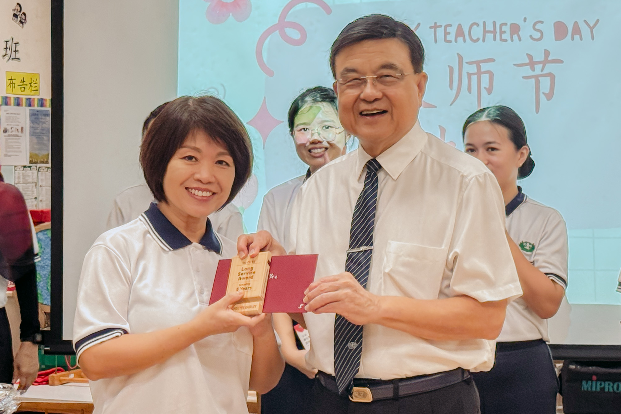 执行长刘瑞士为教师林淑仪颁发“五年长期服务奖”,表彰其多年来的贡献。摄/ 欧凤仪
