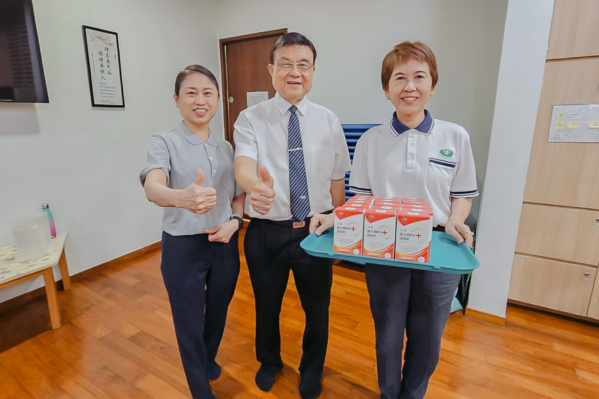 (右起)慈济基金会(新加坡)教育志业发展室主管戴钰郿、执行长刘瑞士及义顺分校的园长周素环,一同为老师与职工送上惊喜,提醒大家在忙碌之余也要关心健康。摄/ 杨粮恺